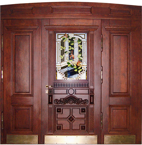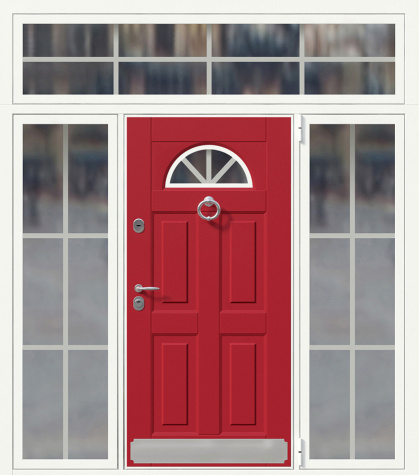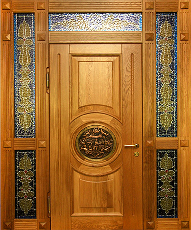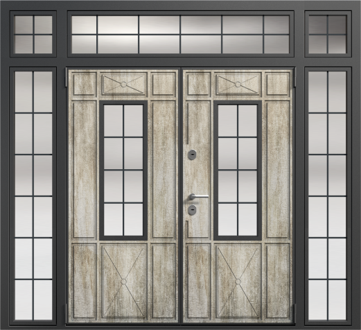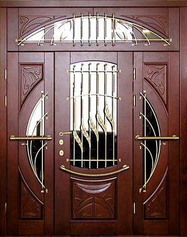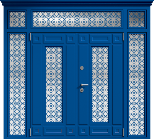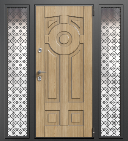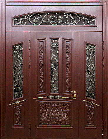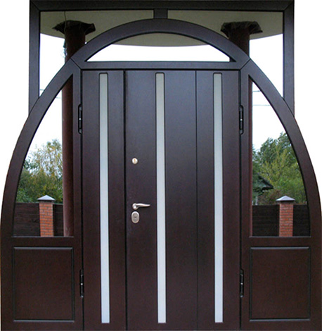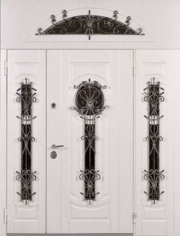 Если проём очень широкий, но не хочется устанавливать двустворчатую модель, используют комбинированные решения. Например, широкая входная дверь со стеклом или глухими боковыми вставками. По бокам основной створки могут быть узкие неподвижные панели: они уменьшают фактическую ширину открывающейся части и украшают вход. Такие вставки нередко содержат стеклопакет с декоративной решёткой или ковкой – подобный дизайн популярен для загородных коттеджей. Остекление выполняется из ударопрочного материала, чтобы дверь оставалась надёжной и безопасной.